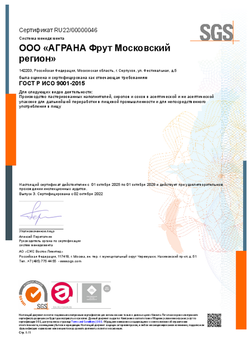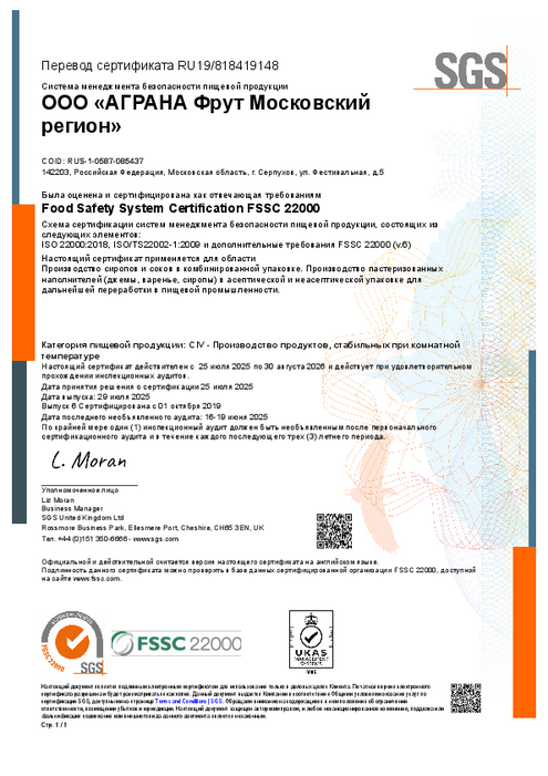 Летом 2025 года компания АГРАНА Фрут Московский регион проходила очередные этапы аудиторского надзора за системами качества и пищевой безопасности, в начале октября получила подтверждающие сертификаты.